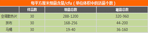 根据复旦大学公共卫生学院环境卫生教研室发布的结果,在调查的30份样本中,细菌与霉菌的检出率均为100%,细菌总数与霉菌总数从多到少大致为空调、抹布、马桶。一般人认为,人体排泄物经过马桶次数最多,污染最为严重,而抹布每天使用、清洁,细菌和霉菌含量应该相对较低,而空调只有在一段时间内进行集中使用,而且有过滤网的存在,可以过滤掉大部分污染物。这一实验研究结果恰恰说明,空调污染最严重。
