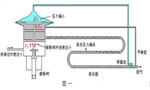 当热力膨胀阀开启度太小时,会造成供液不足。此时,没有足够的氟利昂在蒸发器内蒸发,制冷剂在蒸发管内流动的途中就已经蒸发完了,在这以后的一段蒸发器管中没有液体制冷剂可供蒸发,只有蒸汽被过热。这种情况会导致蒸发速度减慢,单位容积(时间)制冷量下降,制冷效率降低,无法满足系统的制冷需求。